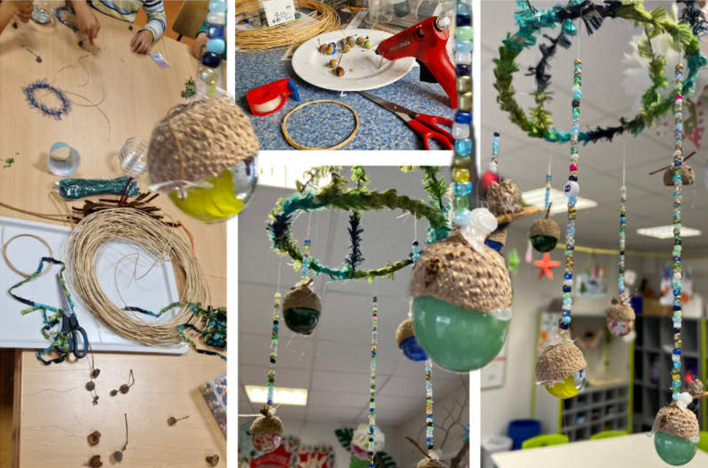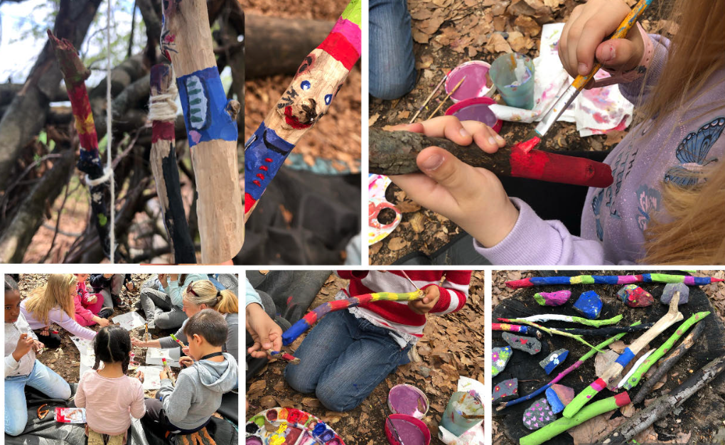 Besonderen Spaß hatten wir am Bach und an der Rotkäppchenhütte. Es wurde gebaut, geschnitzt und wunderschöne bunte Waldmobiles sind entstanden.