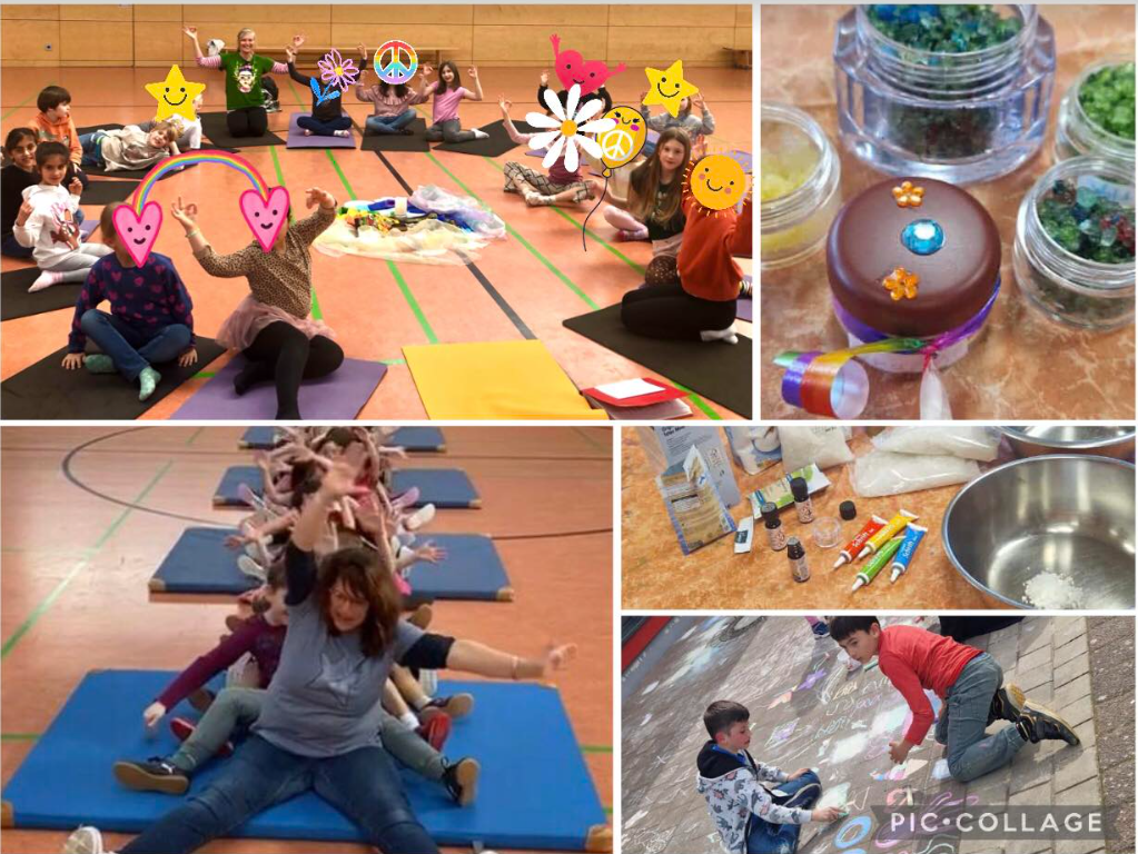 In der zweiten Ferienwoche stand das Thema ,,Fit durch den Tag" im Vordergrund. In der großen Sporthalle gab es viele Spiele, Yoga und Bewegungsangebote. Mit Musik und viel Spaß konnte man den ein oder anderen Regentag in ein schönes Licht tauchen. Für Wellness und Entspannung konnte gut duftendes Badesalz hergestellt und die Verpackungen kreativ und hübsch gestaltet werden.
