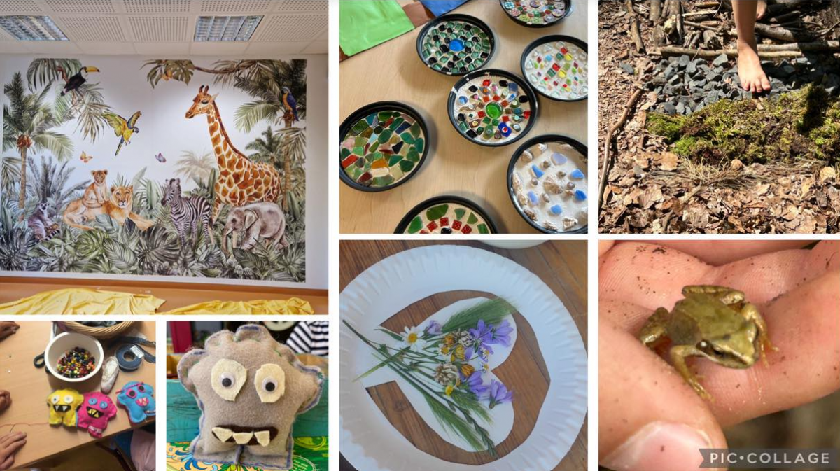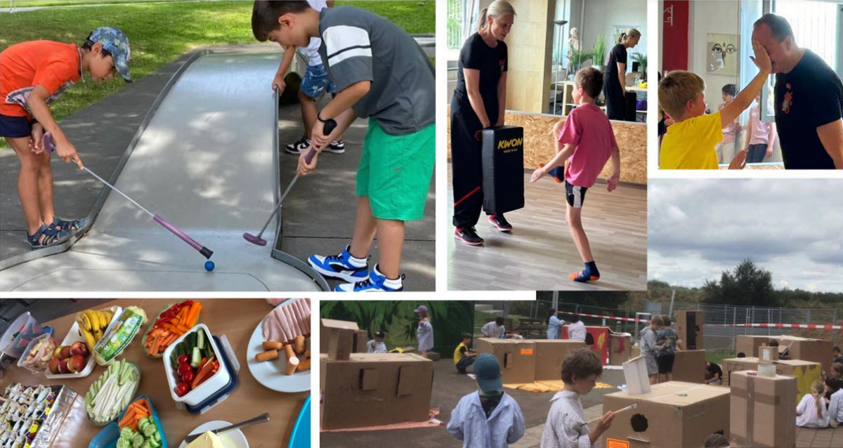 Ein ausgesprochen attraktives Programm erwartete die Betreuungskinder in diesen Sommerferien. Um dem Gedanken der Partizipation auch in puncto Feriengestaltung gerecht zu werden, gab es an vielen Tagen die Möglichkeit an einem Ausflug teilzunehmen oder zwischen verschiedenen Aktivitäten in der Einrichtung zu wählen. Mit fast 70 angemeldeten Kindern und einem unglaublich leckeren bunten Frühstücksbuffet starteten die Ferien bei bester Laune. Eine gute Möglichkeit miteinander ins Gespräch zu kommen, neue Freundschaften zu schließen und die Gruppenzugehörigkeit zu fördern. Immer montags findet auch das große Kindermeeting statt, in dem alle wichtigen Details der kommenden Woche besprochen werden. Wer wollte nicht schon immer mal Kristalle selbst züchten oder aus Pappmaschee schöne Kunstwerke herstellen? Im Laufe der ersten Woche ist eine ganze Kinder-Karton-Stadt entstanden, bei der jedes Kind frei und kreativ mitgestalten konnte. Minigolfen im Bad Nauheimer Kurpark macht an einem schönen Sommertag und unter schattigen Bäumen besonders viel Spaß und auf dem Abenteuerspielplatz Köppern gab es nicht nur viel Bewegung und Sonnenschein, sondern auch noch leckere Pizza vom italienischen Restaurant zum Mittagessen. Auch in diesem Jahr besuchten wir mit 30 Kindern das Red Dragon Wing-Tsun-Zentrum in Friedberg. Wir bedanken uns vielmals bei Familie Weber für die kompetente Betreuung und das speziell auf Grundschulkinder abgestimmte vierstündige Angebot, bei dem die Teilnehmenden viel Spaß hatten und tolle Tricks und Techniken kennenlernen durften, um sich in Gefahrensituationen selbstbewusst und sicher zu verhalten. Mit Kunst, Kultur, Bewegungsspielen und viel frischer Luft ging es dann los in die zweite Ferienwoche. Große Freude hatten die kleinen KünstlerInnen in der Monsternähwerkstatt, beim Anfertigen individueller Mosaikschüsseln und bei der Neugestaltung unseres Ruheraums nach dem Motto „abtauchen und chillen im Dschungel“. Passend dazu, verbrachten wir zwei Tage im Rosbacher Beinhardswald. Ein Tag in der Natur tut allen gut, die Phantasie wird angeregt und die Kinder tauchen ein in eine andere wohltuende Art des Spielens. Sie haben Zeit, zu erkunden und zu erobern was ihnen der Wald alles bietet. Tipis werden gebaut, Totholz und Baumwurzeln untersucht, es wird gesammelt, gefühlt, geschnitzt und ganz nebenbei ist ein richtig toller Barfußpfad entstanden.
