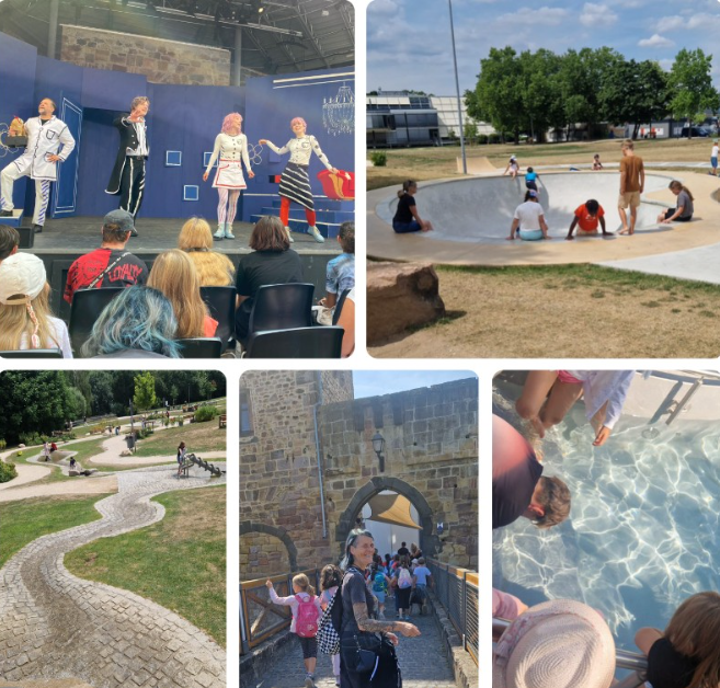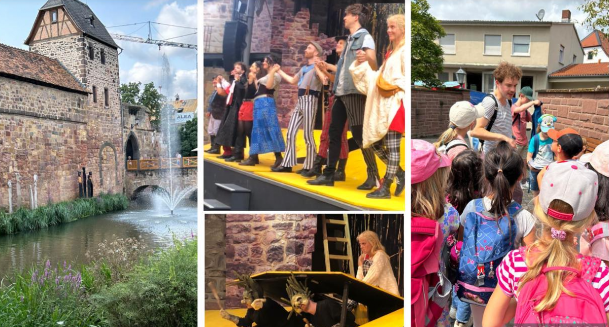 Zum Abschluss dieser Woche unternahmen wir einem Ausflug nach Bad Vilbel zu den Burgfestspielen. Das Theaterstück "das doppelte Lottchen" war sehr modern und spanned umgesetzt und nicht nur die Mädchen waren davon angetan. Mit einer großen Kindergruppe ins Theater zu gehen ist immer wieder ein kleines Überraschungspaket.... wir hatten viel Spaß und Freude und sind stolz auf unsere tollen Kinder. Bevor es wieder zurück in die Betreuung ging, hatten wir eine schöne Mittagszeit auf dem Wasserspielplatz im angrenzenden Park.
