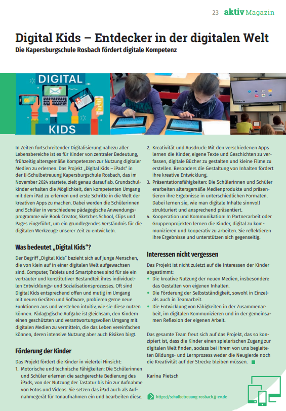 Unter dem folgenden Link finden Sie auf den Seiten 10/11 in der neuen August 2021 Ausgabe des JJ Aktiv Magazins einen Bericht über "Mitwirkung/Beteiligung in der Schulbetreuung an der Kapersburgschule" Das JJ Aktiv Magazin zum Downloaden!