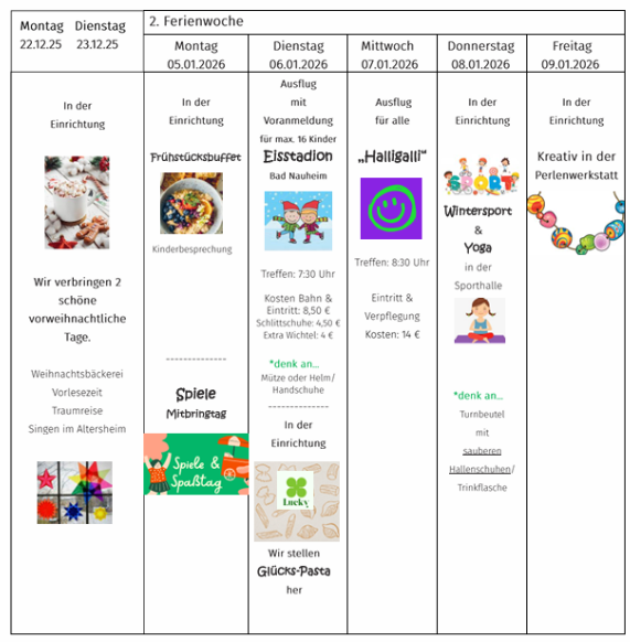 Ferienzeit ist immer eine ganz besondere Zeit und jede Jahreszeit hat ihren eigenen Zauber. Auch dieses Jahr, haben wir einige schöne Ausflüge geplant und gemütliche Stunden in den Räumen der Betreuung verbracht. Wir waren zum Schlittschuhlaufen in Bad Nauheim und hatten sehr viel Spaß dabei. Ein weiteres Highlight war der Besuch der Experiminta in Frankfurt mit über 30 angemeldeten Kindern :-) Hier durften wir sogar das Teufelsrad erkunden, auf 4 verschiedenen Ebenen/Stockwerken außergewöhnliche Phänomene bestaunen und an 130 Stationen experimentieren, ausprobieren und Mathematik, Informatik, Naturwissenschaften und Technik spannend erfahren. Zwischen den Ausflügen wurde gespielt und gebastelt und besondere Freude hatten wir bei der Herstellung der Neujahrs-Glück-bring-PASTA. So kann das Jahr gut beginnen.